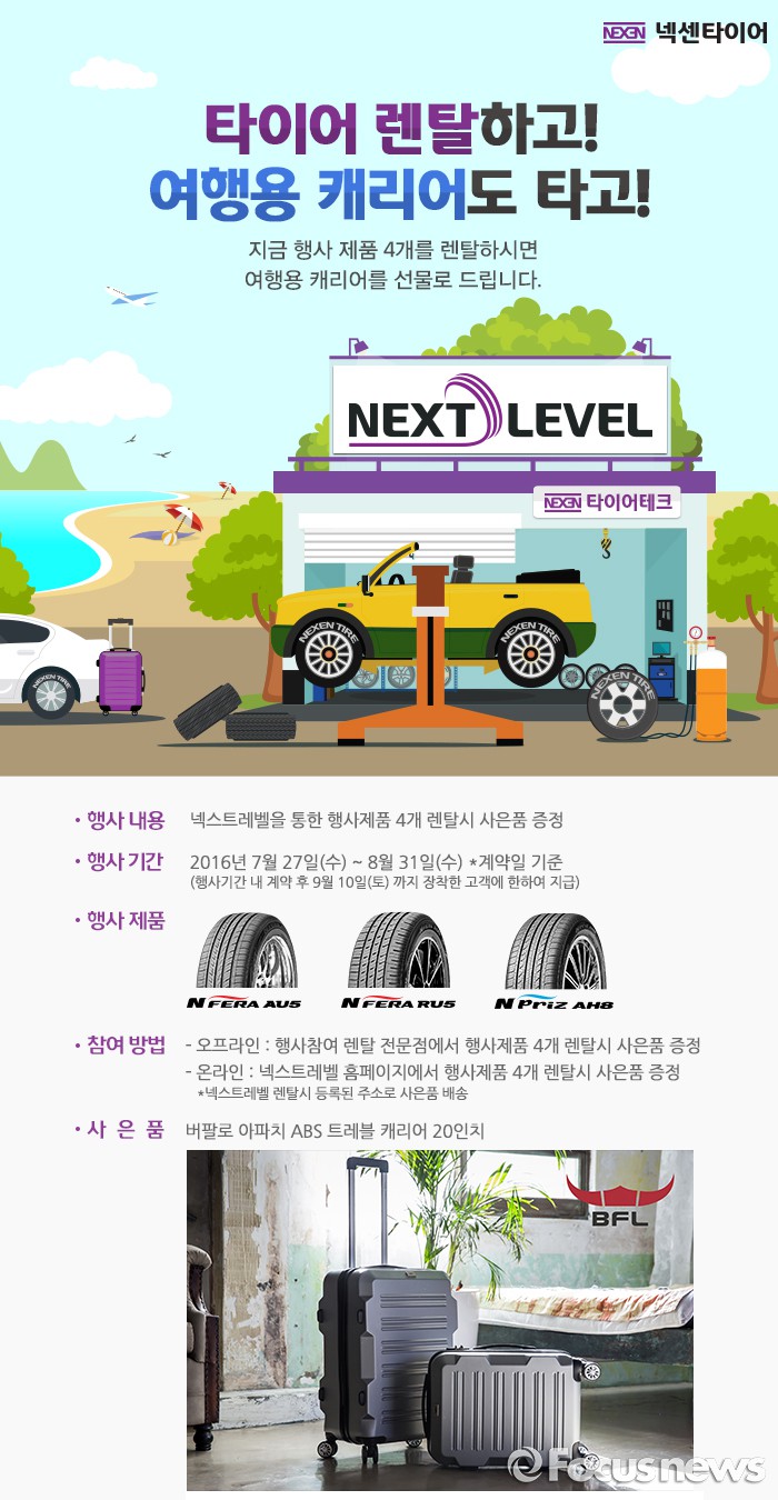 (서울=포커스뉴스) 넥센타이어가 본격적인 여름 휴가철을 맞아 넥스트레벨 신규 렌탈 가입 고객을 대상으로 사은 이벤트를 진행한다.