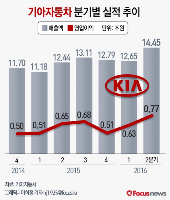 (서울=포커스뉴스) 27일 기아자동차는 2016년 2분기 매출액 14조4500억원, 영업이익은 7709억원을 기록했다고 공시했다.