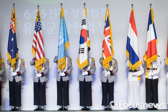 (서울=포커스뉴스) 27일 오전 서울 송파구 올림픽공원 올림픽홀에서 열린 정전협정 63주년 및 유엔군 참전의 날 기념식에서 장병들이 참전국가 국기를 들고 있다.