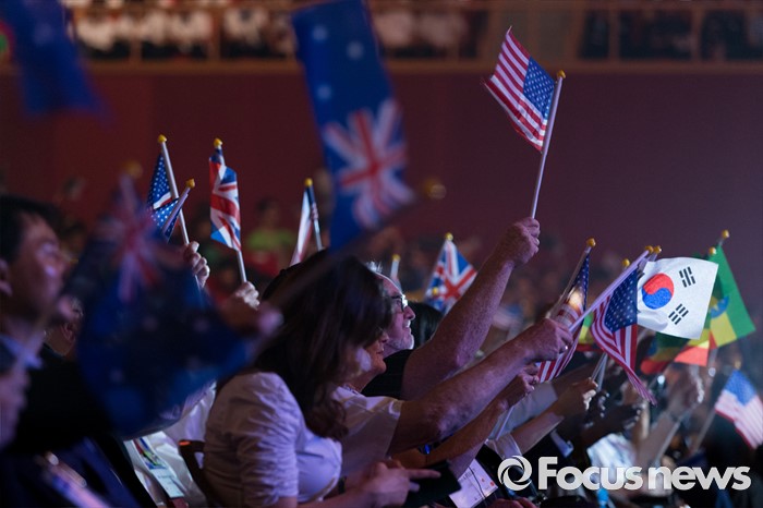 (서울=포커스뉴스) 27일 오전 서울 송파구 올림픽공원 올림픽홀에서 열린 정전협정 63주년 및 유엔군 참전의 날 기념식에서 6·25 전쟁 유엔군 참전용사와 참전국 외교사절단이 국기를 흔들고 있다.