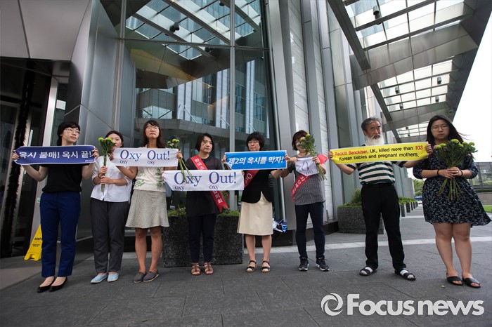 (서울=포커스뉴스) 27일 오전 서울 영등포구에 위치한 옥시레킷벤키저 본사 앞에서 가습기살균제참사전국네트워크 회원들이 '제2의 옥시를 막자-가습기살균제사고 기업 현장조사' 기자회견을 하고 있다.