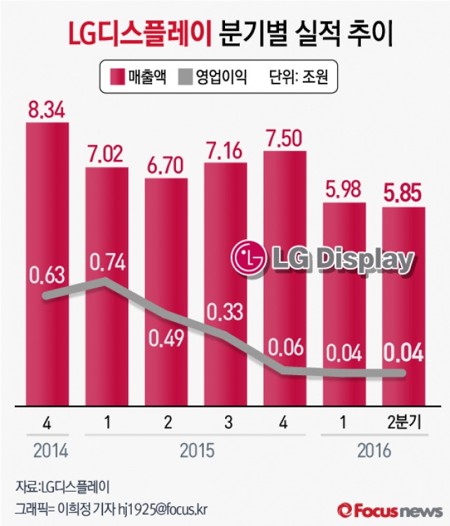 (서울=포커스뉴스) LG디스플레이가 올 2분기 영업이익이 전년대비 90%이상 대폭 감소했지만 17년 분기 연속 흑자를 나타냈다.
