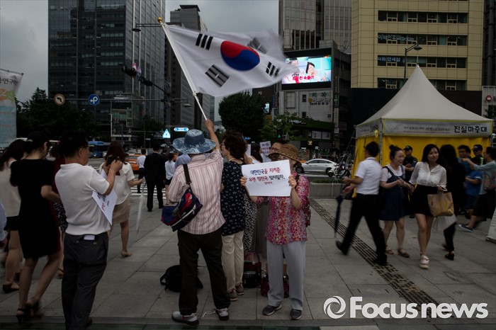 (서울=포커스뉴스) 27일 오전 서울 종로구 광화문광장에서 엄마부대, 나라지키기운동본부 등 4개 단체 회원들이 정전협정 63주년 기자회견을 하고 있다.