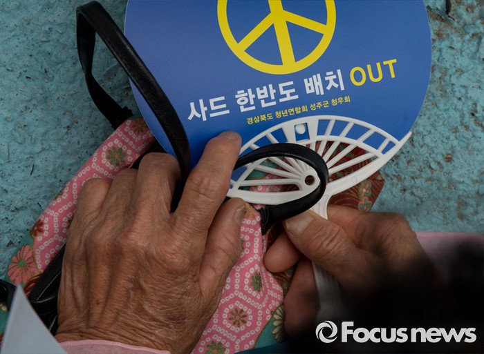 (서울=포커스뉴스) 27일 오전 서울 종로구 청운효자동 주민자치센터 앞에서 열린 '사드 배치 반대 기자회견'에 참석한 성주 유림단체 회원이 사드 배치를 반대하는 부채를 들고 있다.