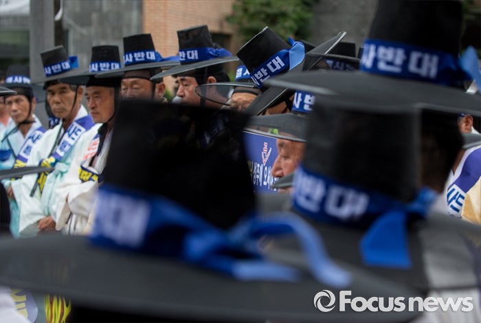 (서울=포커스뉴스) 27일 오전 서울 종로구 청운효자동 주민자치센터 앞에서 열린 '사드 배치 반대 기자회견'에 참석한 성주 유림단체 회원들이 갓 위로 사드 반대가 적힌 머리띠를 두르고 있다.