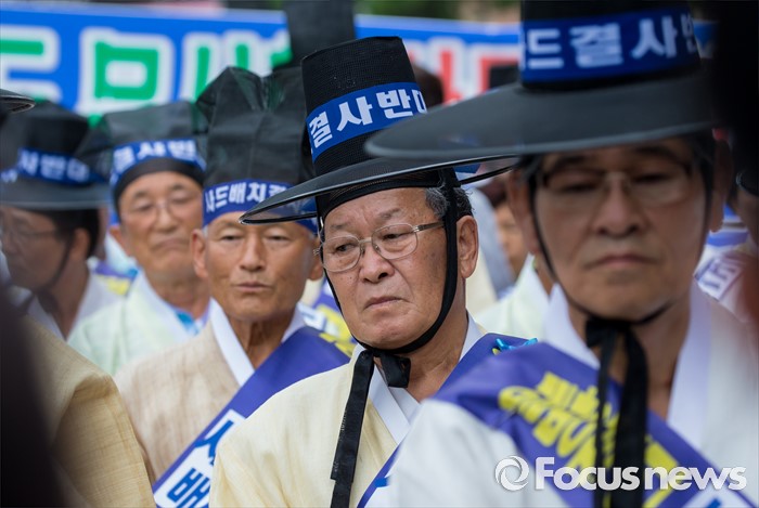 (서울=포커스뉴스) 27일 오전 서울 종로구 청운효자동 주민자치센터 앞에서 열린 '사드 배치 반대 기자회견'에 참석한 성주 유림단체 회원들이 갓 위로 사드 반대가 적힌 머리띠를 두르고 있다.