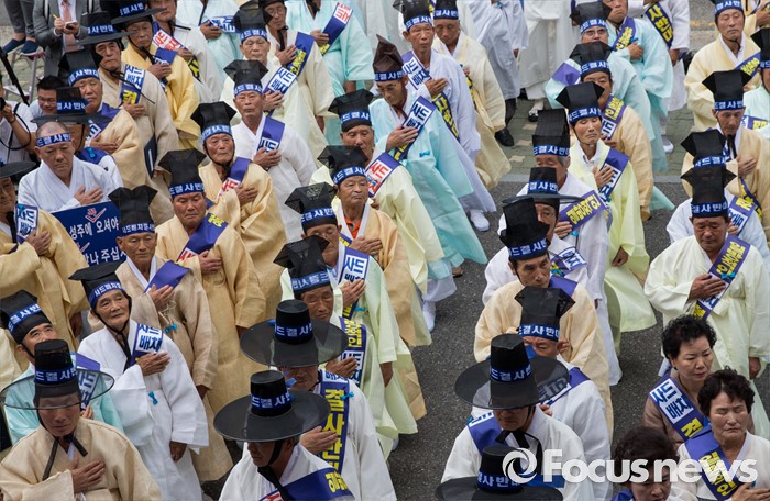 (서울=포커스뉴스) 27일 오전 서울 종로구 청운효자동 주민자치센터 앞에서 열린 '사드 배치 반대 기자회견'에 참석한 성주 유림단체 회원들이 국민의례를 하고 있다.