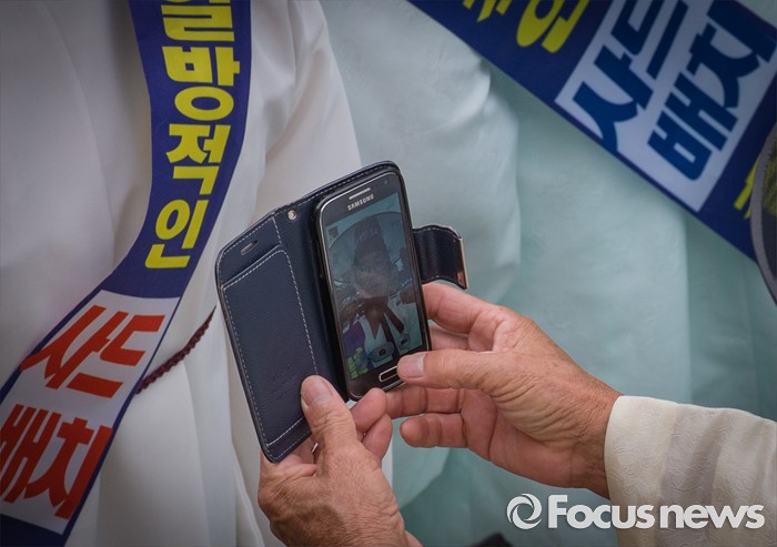 (서울=포커스뉴스) 27일 오전 서울 종로구 청운효자동 주민자치센터 앞에서 열린 '사드 배치 반대 기자회견'에 참석한 성주 유림단체 회원이 셀카를 찍고 있다.