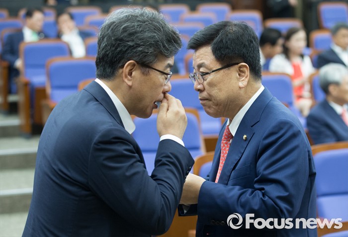 (서울=포커스뉴스) 27일 오전 서울 여의도 국회에서 열린 새누리당 의원총회에 참석한 김광림(오른쪽) 정책위의장과 송언석 기획재정부 2차관이 대화하고 있다.