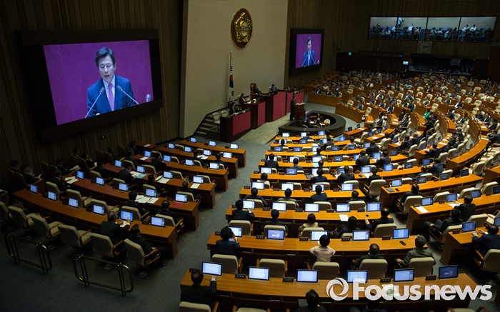 (서울=포커스뉴스) 27일 오후 서울 여의도 국회에서 열린 344회 국회(임시회) 3차 본회의에 참석한 황교안 국무총리가 2016년도 제1회 추가경정예산안에 대한 정부의 시정연설을 하고 있다.