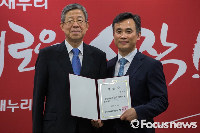 (서울=포커스뉴스) 박요찬 현 새누리당 경기도당 윤리위원회 위원이 27일 오후 서울 여의도 새누리당사에서 열린 윤리위원회 위원 임명장 수여식에 참석, 이진곤 위원장으로부터 임명장을 받은 뒤 기념촬영을 하고 있다.