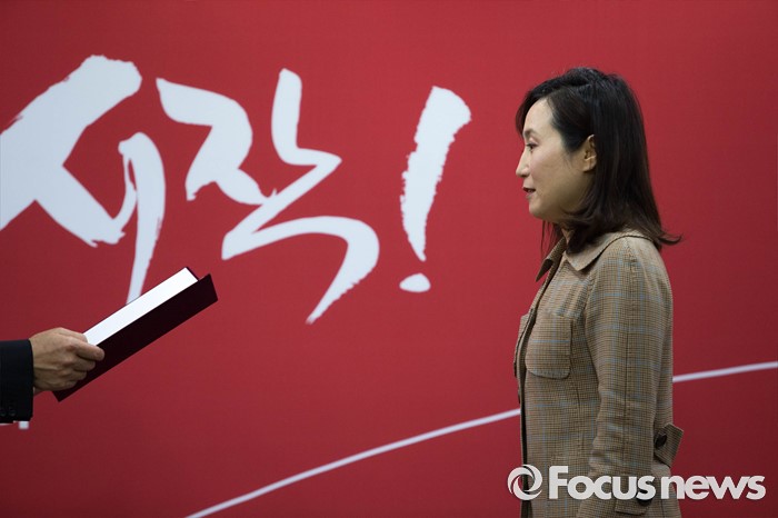 (서울=포커스뉴스) 전주혜 전 서울중앙지법 부장판사가 27일 오후 서울 여의도 새누리당사에서 열린 윤리위원회 위원 임명장 수여식에 참석, 이진곤 위원장으로부터 임명장을 받고 있다.