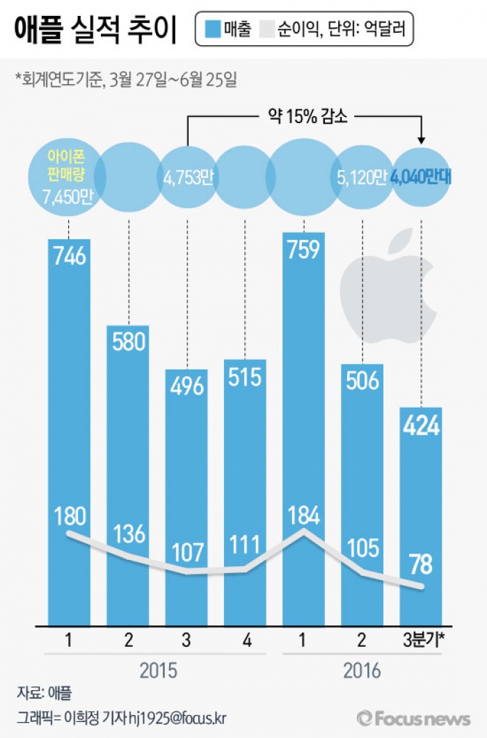 (서울=포커스뉴스) 회계연도 3분기(3월 27일~6월 25일) 애플 판매 실적이 매출액 424억 달러(약 48조3000억원), 순이익 78억 달러(약 8조9000억원)로 집계되 2분기 연속 감소했다. 2016년 3분기 아이폰 판매량 또한 예상치를 가까스로 넘긴 것으로 나타났다.