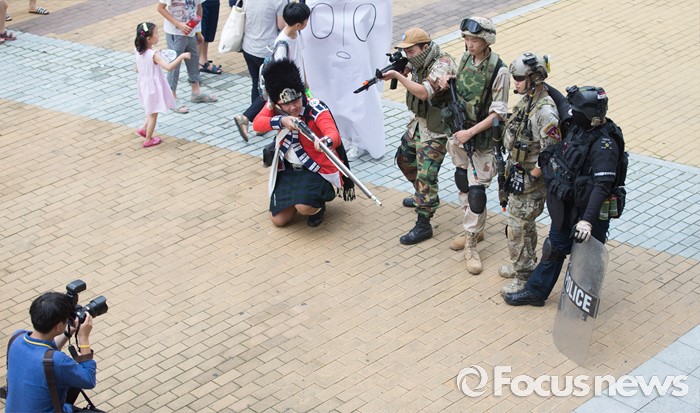 (부천=포커스뉴스) 27일 오후 경기도 부천시 한국만화박물관에서 열린 '제19회 부천국제만화축제'에 참여한 한 취재진이 코스어들을 촬영하고 있다.