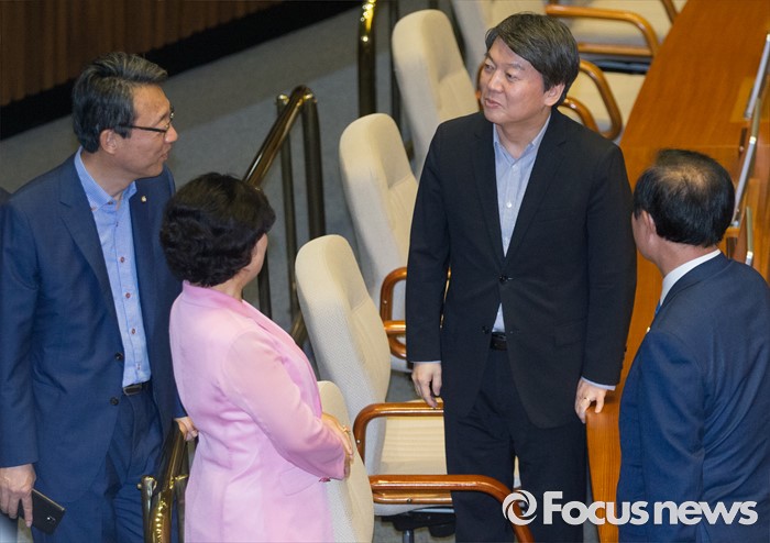(서울=포커스뉴스) 27일 오후 서울 여의도 국회에서 열린 344회 국회(임시회) 3차 본회의에 참석한 안철수 국민의당 전 상임공동대표가 김성식 정책위의장 등 의원들과 대화하고 있다.