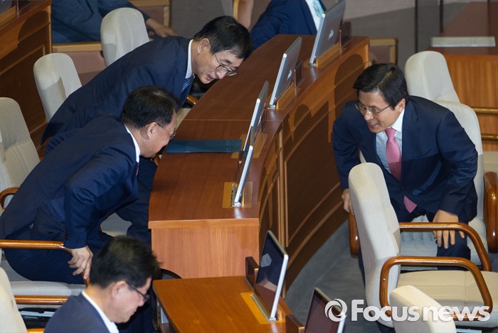 (서울=포커스뉴스) 27일 오후 서울 여의도 국회에서 열린 344회 국회(임시회) 3차 본회의에 참석한 황교안 국무총리와 유일호 경제부총리 겸 기획재정부 장관, 이준식 사회부총리 겸 교육부 장관이 인사하고 있다.