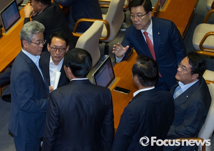 (서울=포커스뉴스) 27일 오후 서울 여의도 국회에서 열린 344회 국회(임시회) 3차 본회의에 참석한 정진석 새누리당 원내대표, 김광림 정책위의장, 김도읍 원내수석부대표, 이철우, 안상수, 이완영 의원 등이 대화하고 있다.