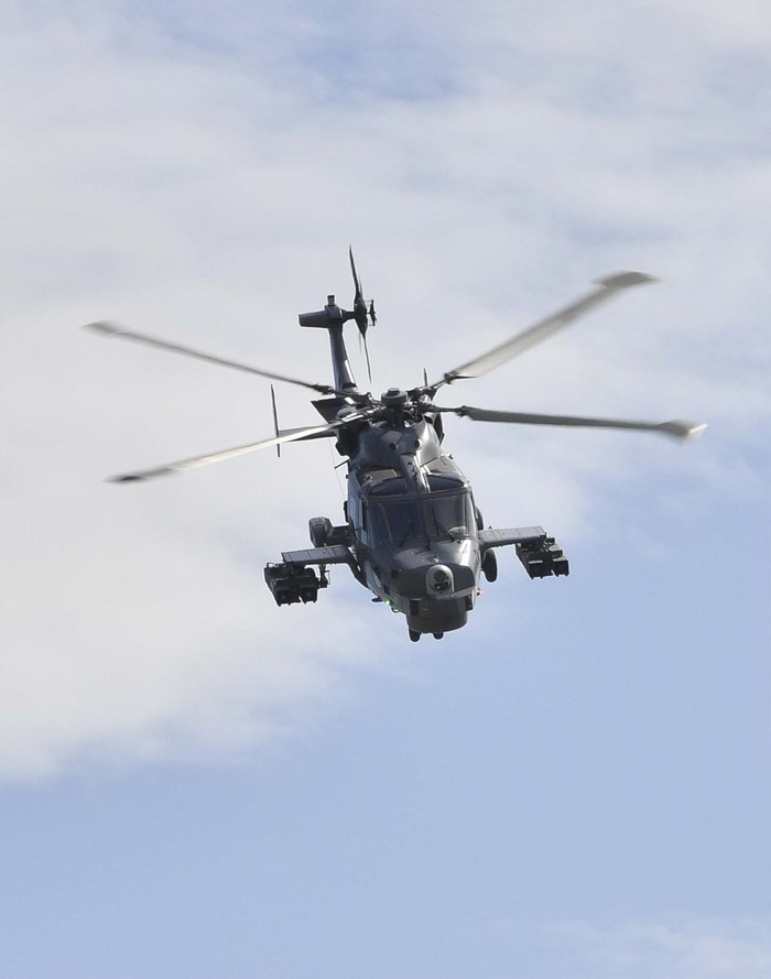 (서울=포커스뉴스) 27일 경남 진해 해군 62전대에서 열린 신형 해상작전헬기(AW-159) 인수식에서 시범비행을 선보이고 있다. <사진제공=해군>
