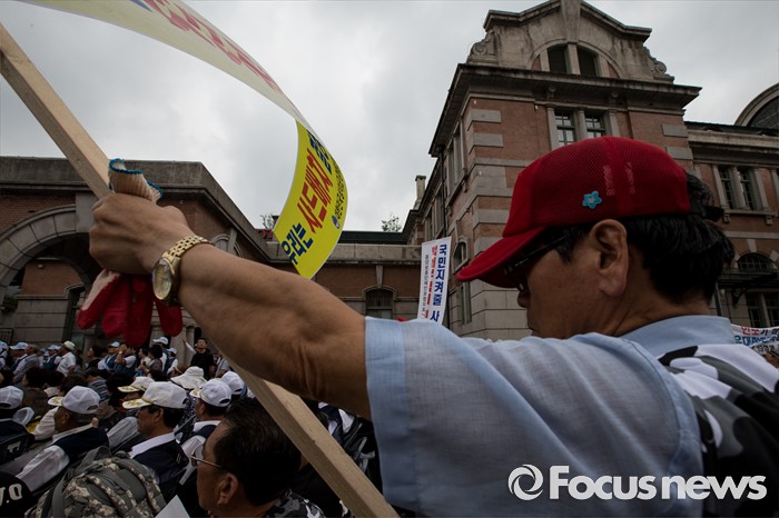 (서울=포커스뉴스) 27일 오후 서울 용산구 서울역광장에서 열린 사드배치 지지 범국민대회 및 자유민주평화통일 결의대회에 한 참석자가 사드 배치를 환영하는 현수막을 들고 있다.