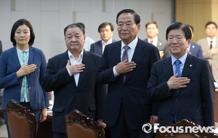 (서울=포커스뉴스) 27일 오후 서울 여의도 국회 의원회관에서 열린 한일의원연맹 간사회 및 총회에 참석한 박병석(오른쪽부터) 더불어민주당 의원, 서청원 새누리당 의원, 강창일, 박영선 더불어민주당 의원 등이 국기에 대한 경례를 하고 있다.