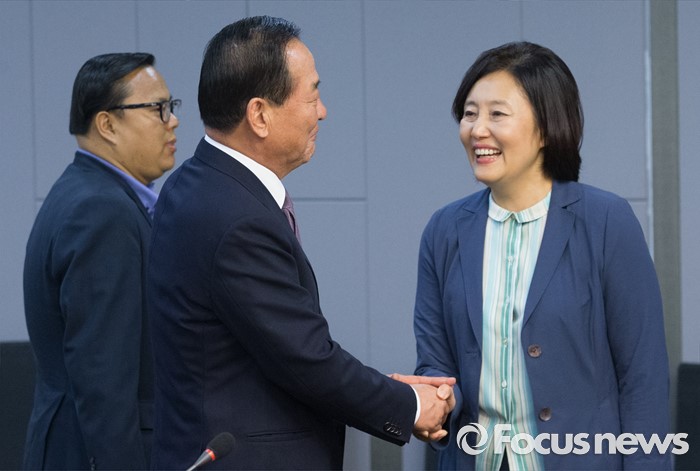 (서울=포커스뉴스) 27일 오후 서울 여의도 국회 의원회관에서 열린 한일의원연맹 간사회 및 총회에 참석한 서청원(왼쪽) 새누리당 의원이 박영선 더불어민주당 의원과 인사하고 있다.