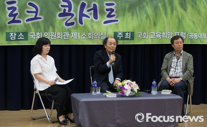 (서울=포커스뉴스) 27일 오후 서울 여의도 국회 의원회관에서 국회 교육희망포럼 주최로 열린 교육 토크 콘서트에 참석한 조정래(가운데) 작가가 발언하고 있다. 오른쪽은 도종환 더불어민주당 의원.