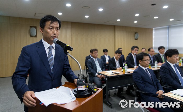(분당=포커스뉴스) 27일 오후 경기도 성남 분당구 SK케미칼 본사에서 열린 가습기살균제 사고 진상규명과 피해구제 및 재발방지 대책마련을 위한 국정조사특별위원회 현장조사에서 김철 SK케미칼 대표이사가 업무보고를 하고 있다.