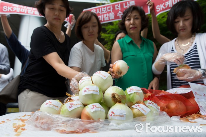 (분당=포커스뉴스) 27일 오후 경기도 성남 분당구 SK케미칼 본사 앞에서 가습기살균제 참사 전국네트워크가 양파 까기 퍼포먼스를 하고 있다.
