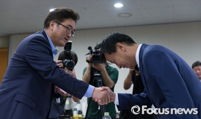 (분당=포커스뉴스) 27일 오후 경기도 성남 분당구 SK케미칼 본사에서 열린 가습기살균제 사고 진상규명과 피해구제 및 재발방지 대책마련을 위한 국정조사특별위원회 현장조사에서 우원식(왼쪽) 위원장이 김철 SK케미칼 대표이사와 인사를 하고 있다.