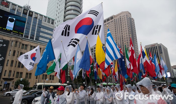 (서울=포커스뉴스) 27일 오후 서울 종로구 세종문화회관 인근에서 월드피스자유연합 관계자들이 6.25전쟁 당시 대한민국 지원 세계 67개국 국기를 들고 퍼레이드를 하고 있다.
