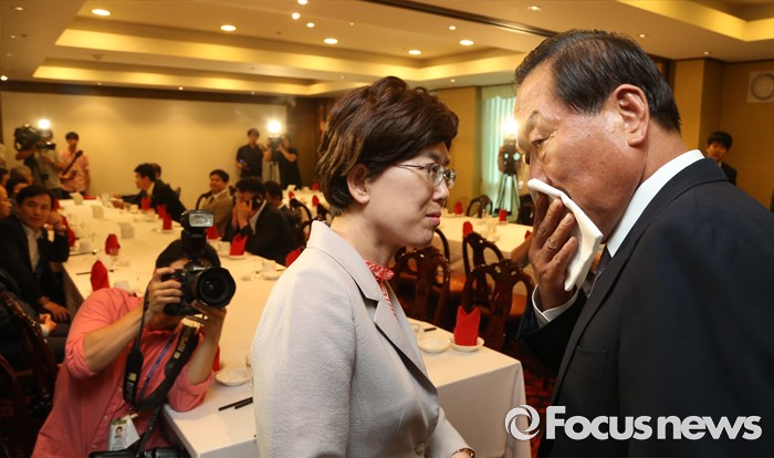 (서울=포커스뉴스) 27일 오후 서울 영등포구 여의도 한 식당에서 열린 친박(친박근혜)계 의원 만찬회동에서 서청원(오른쪽) 새누리당 의원과 최연혜 의원이 이야기를 나누고 있다.