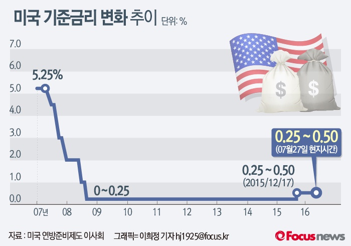 (서울=포커스뉴스) 미국 연방준비제도는 7월 27일(현지시간) 연방공개시장위원회(FOMC) 정례회의를 열고 현행 0.25%~0.50%인 기준금리를 유지하기로 결정했다.