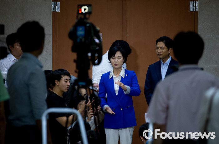 | △ 취재진 질문 답하는 추미애 |