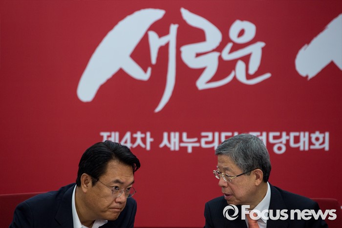 (서울=포커스뉴스) 김희옥(오른쪽) 새누리당 혁신비상대책위원장과 정진석 원내대표가 28일 오전 서울 여의도 새누리당사에서 열린 혁신비상대책위원회의에 참석해 의견을 나누고 있다.