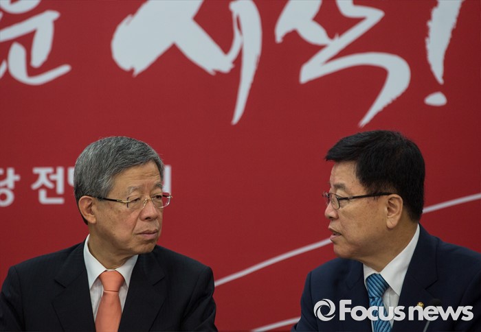 (서울=포커스뉴스) 김희옥(왼쪽) 새누리당 혁신비상대책위원장과 김광림 정책위의장이 28일 오전 서울 여의도 새누리당사에서 열린 혁신비상대책위원회의에 참석해 의견을 나누고 있다.