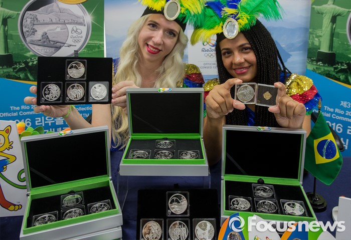 (서울=포커스뉴스) 28일 오전 서울 종로구 주한 브라질대사관에서 현지인 복장의 대사관 직원들이 '2016 리우 올림픽 기념주화'를 선보이고 있다.