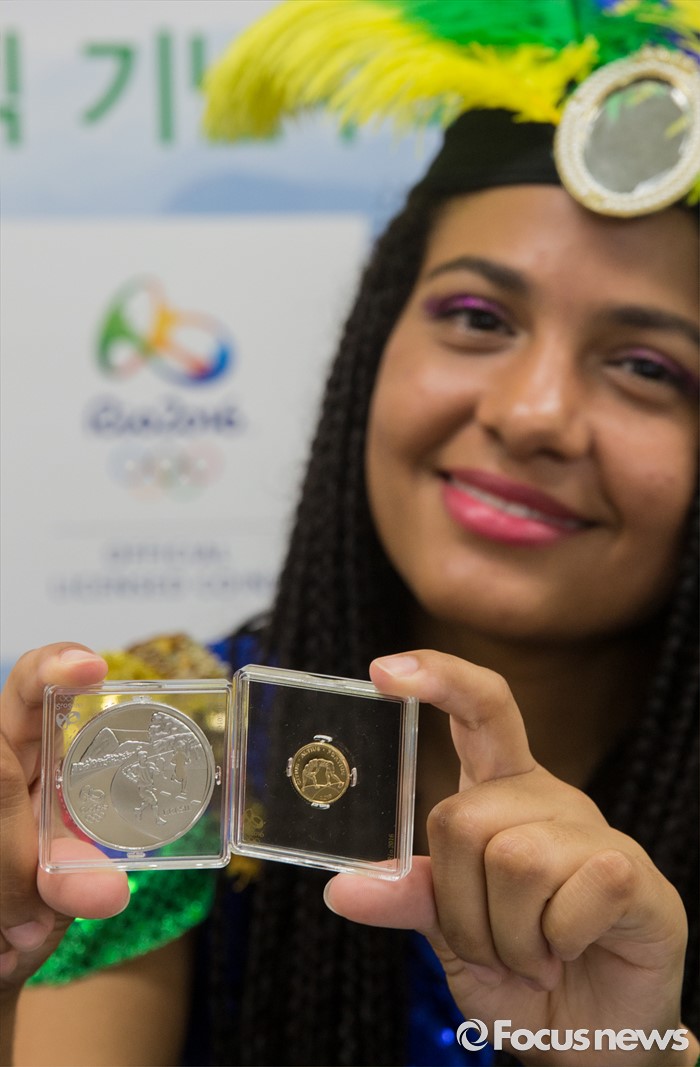 (서울=포커스뉴스) 28일 오전 서울 종로구 주한 브라질대사관에서 현지인 복장의 대사관 직원이 '2016 리우 올림픽 기념주화'를 선보이고 있다.