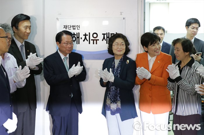 (서울=포커스뉴스) 위안부 지원 재단인 화해 ·치유재단이 공식 출범하는 28일 오전 서울 서대문구 바비엥 스위트에서 김태현 이사장(오른쪽 세 번째), 윤병세(왼쪽 두 번째) 외교부 장관, 강은희 여성가족부 장관(오른쪽 두 번째)을 비롯한 위원들이 현판 제막식 후 박수치고 있다.