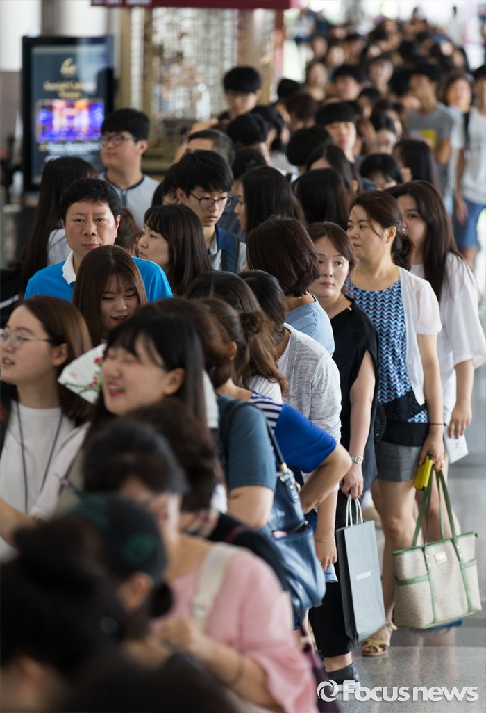 (서울=포커스뉴스) 28일 오전 서울 강남구 코엑스에서 열린 2017학년도 수시 대학입학정보박람회 행사장을 찾은 학부모와 학생들이 입장을 기다리고 있다. 이번 박람회는 7월 28일부터 31일까지 나흘간 진행되며 전국 140개 4년제 대학이 참가한다.