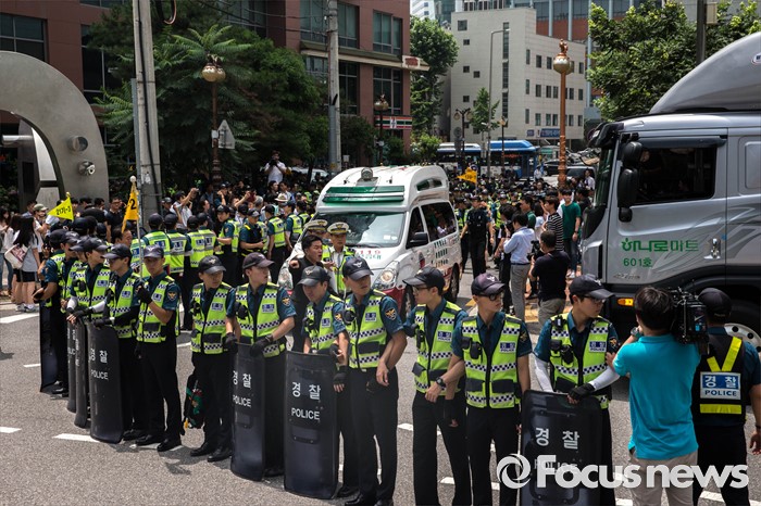 (서울=포커스뉴스) 28일 오후 서울 서대문구에 위치한 '화해·치유 재단' 사무실 인근에서 열린 기자간담회에 참석한 김태현 이사장이 간담회 후 건물을 빠져 나가다 활동가들이 뿌린 캡사이신을 얼굴에 맞고 119 구급차에 탑승해 급히 현장을 빠져나가고 있다.
