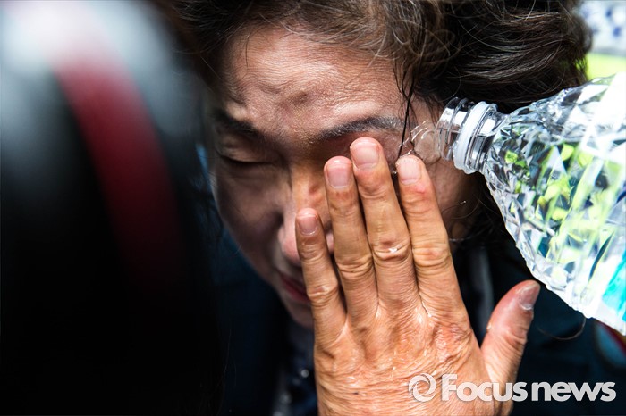 (서울=포커스뉴스) 28일 오후 서울 서대문구에 위치한 '화해·치유 재단' 사무실 인근에서 열린 기자간담회에 참석한 김태현 이사장이 간담회 후 건물을 빠져 나가다 활동가들이 뿌린 캡사이신을 얼굴에 맞고 고통스러워 하고 있다.