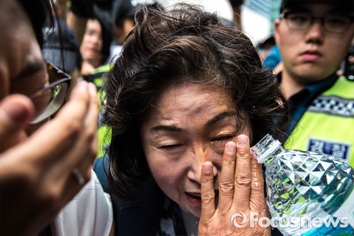 (서울=포커스뉴스) 28일 오후 서울 서대문구에 위치한 '화해·치유 재단' 사무실 인근에서 열린 기자간담회에 참석한 김태현 이사장이 간담회 후 건물을 빠져 나가다 활동가들이 뿌린 캡사이신을 얼굴에 맞고 고통스러워 하고 있다.