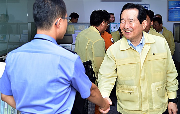 (서울=포커스뉴스) 정세균 국회의장이 28일 오전 정부서울청사 국민안전처 중앙재난안전상황실을 방문해 관계자들과 인사하고 있다. <사진제공=국회>
