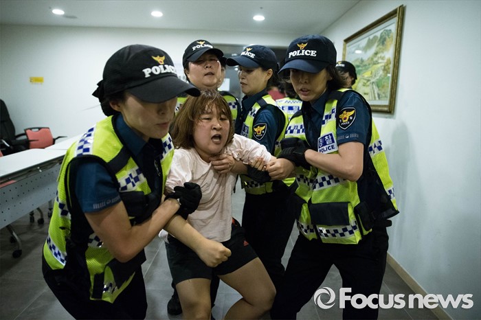 (서울=포커스뉴스) '화해·치유 재단'이 공식 출범한 28일 오전 서울 중구에 위치한 한 건물에서 열린 재단 출범 이사장 기자간담회장에서 재단 출범에 반대하는 대학생들이 회견장을 점거, 농성을 벌이고 있다.