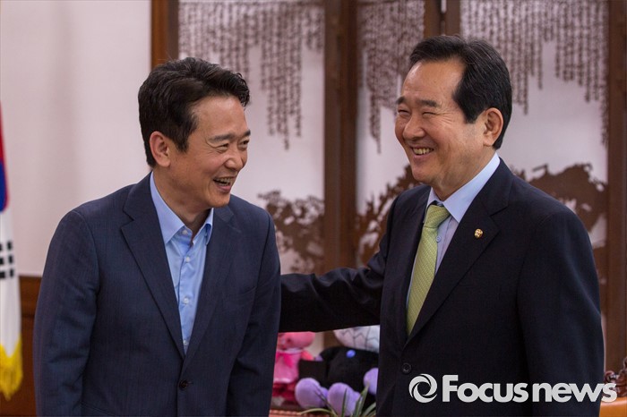 (서울=포커스뉴스) 정세균(오른쪽) 국회의장과 남경필 경기도지사가 28일 오후 서울 여의도 국회 의장접견실에서 회동에 앞서 인사 하고 있다.