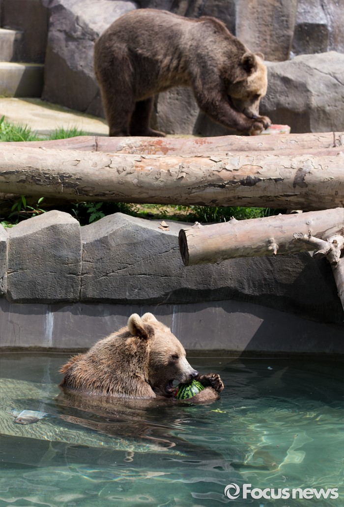 (과천=포커스뉴스) 28일 오후 경기도 과천 서울동물원에서 불곰이 얼음과일을 먹고 있다.