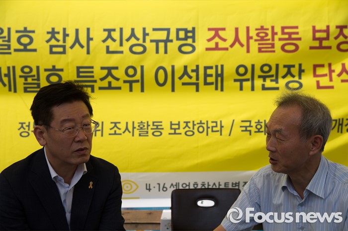 (서울=포커스뉴스) '세월호 참사 진상규명 조사활동 보장’을 위한 단식농성 이틀째인 이석태(오른쪽) 세월호 특별조사위원장이 28일 오후 서울 종로구 광화문광장 농성장을 찾은 이재명 성남시장과 대화하고 있다.