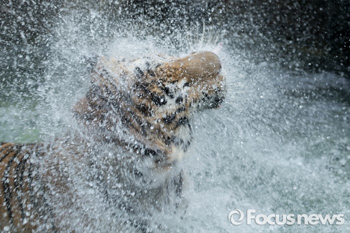 (과천=포커스뉴스) 28일 오후 경기도 과천 서울동물원에서 시베리아 호랑이가 얼린 닭고기를 먹으며 몸에 묻은 물기를 털어내고 있다.
