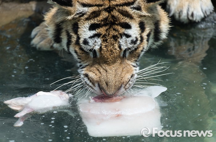 (과천=포커스뉴스) 28일 오후 경기도 과천 서울동물원에서 시베리아 호랑이가 얼린 닭고기를 먹으며 더위를 식히고 있다.