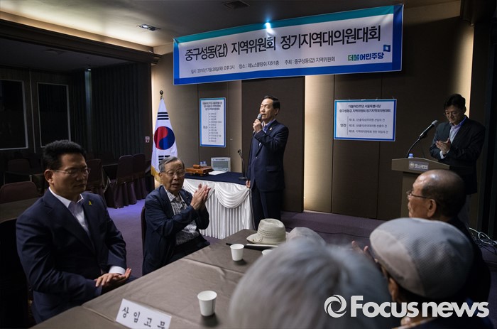 (서울=포커스뉴스) 더불어민주당 김상곤 전 혁신위원장이 28일 오후 서울 성동구 레노스블랑쉬 웨딩홀에서 열린 서울 중구·성동갑 지역대의원대회에서 발언하고 있다.